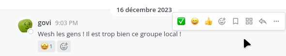 Grâce au menu qui apparaît lorsque tu passes la souris sur un message, tu peux y réagir directement avec des emojis (ça permet par exemple d'avoir un avis général sans polluer le canal avec des « je suis d'accord »!)