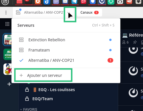 Si jamais tu utilises déjà Mattermost avec d'autres collectifs (XR ou sur une équipe Framateam par exemple), tu peux ajouter un nouveau serveur dans l'application pour pouvoir naviguer de l'un à l'autre très facilement depuis la même application. Pour ajouter le nouveau serveur, clique sur la flèche en haut à gauche près du nom du serveur que tu utilises déjà :